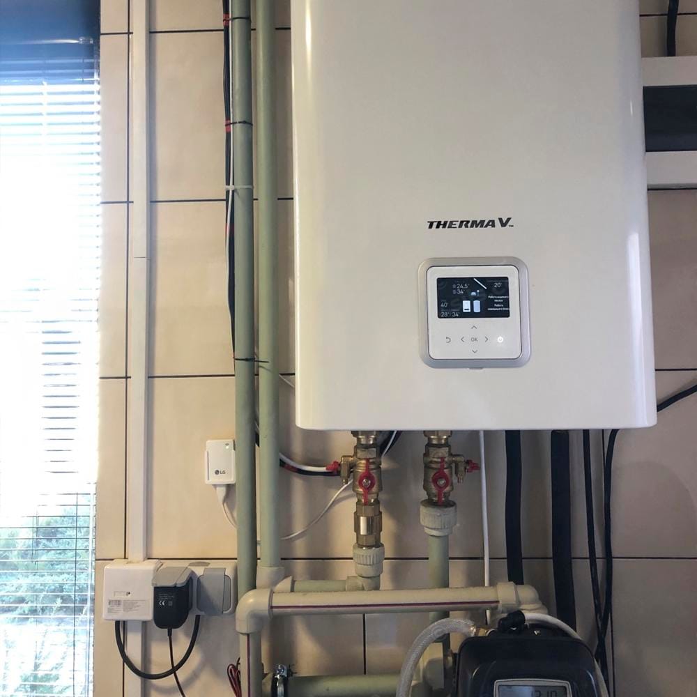 - Встановлення обладнання: Зовнішній блок теплового насоса LG був встановлений на спеціально підготовлений металевий постамент для забезпечення стабільності та захисту від зовнішніх впливів. Внутрішній блок, акумулюючий бак на 300 літрів для системи опалення та бойлер непрямого нагріву на 300 літрів для ГВП, були інтегровані в існуючу систему опалення будинку.