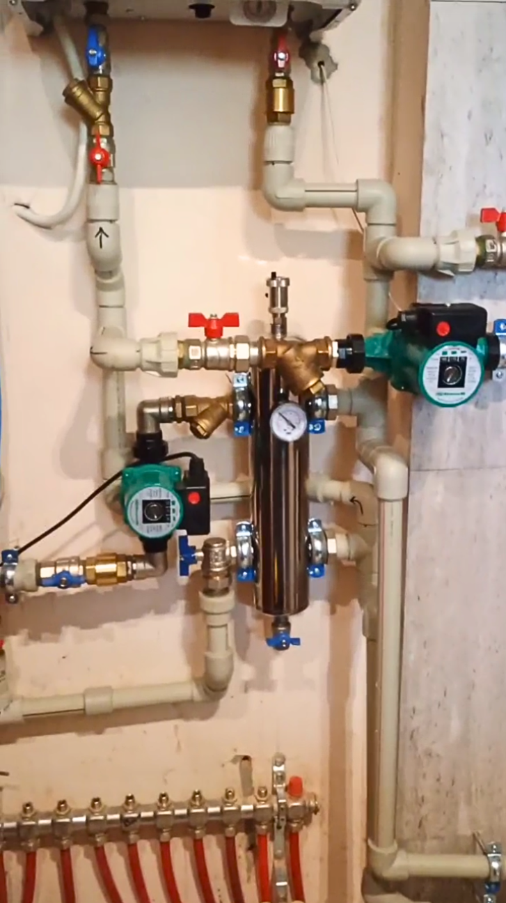 Гідравлічна стрілка дозволяє балансувати систему опалення, рівномірно розподіляючи теплоносій по всіх контурах. Це особливо важливо при наявності декількох джерел тепла, таких як електрокотел, тепловий насос вода-вода і новий інверторний тепловий насос. Насосна група була інтегрована для ефективного управління потоками теплоносія між різними частинами системи.