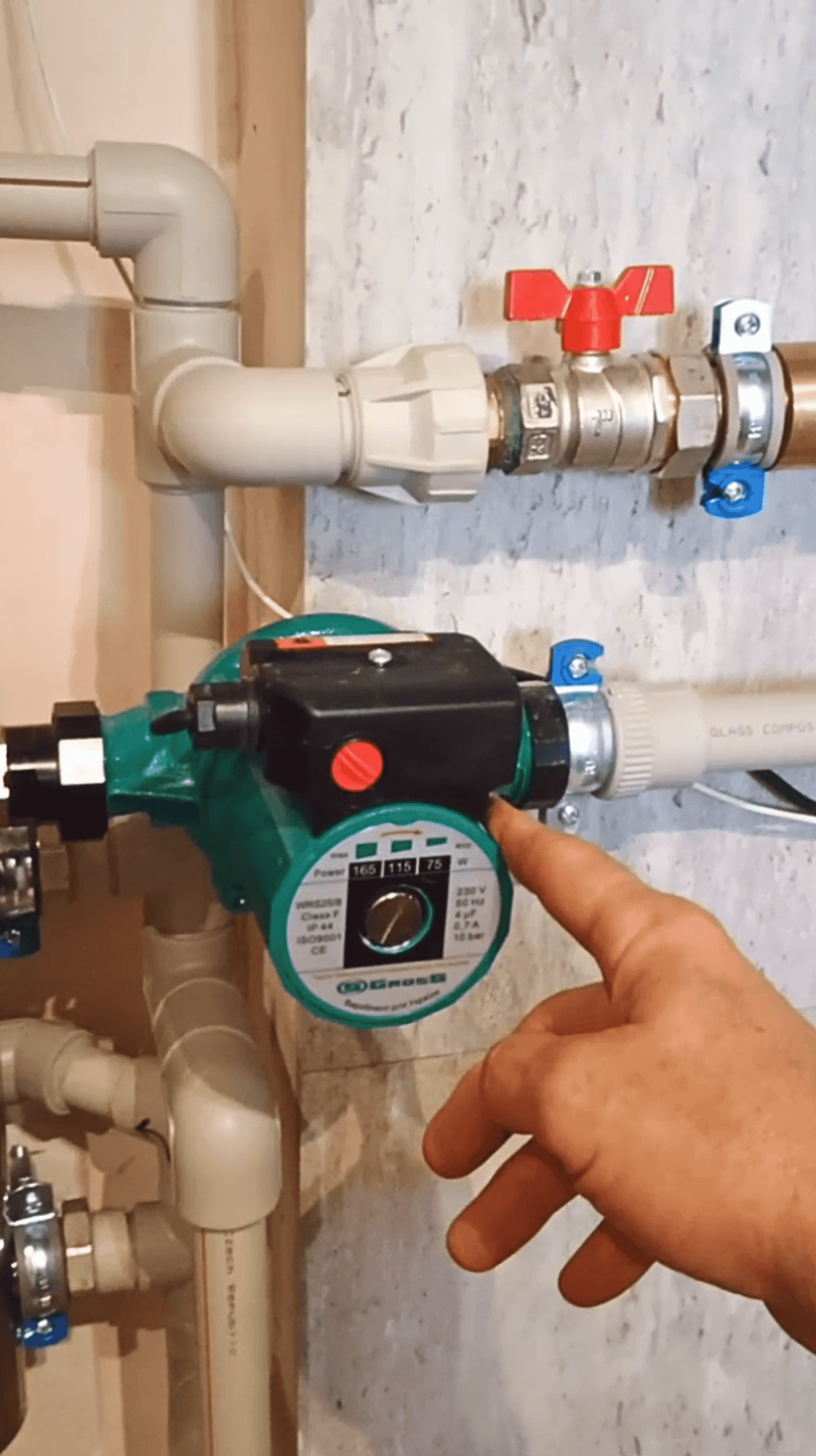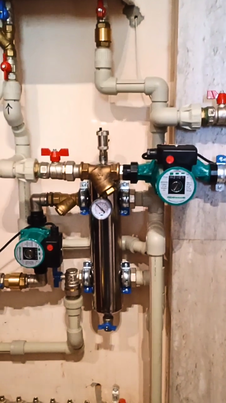Гідравлічна стрілка дозволяє балансувати систему опалення, рівномірно розподіляючи теплоносій по всіх контурах. Це особливо важливо при наявності декількох джерел тепла, таких як електрокотел, тепловий насос вода-вода і новий інверторний тепловий насос. Насосна група була інтегрована для ефективного управління потоками теплоносія між різними частинами системи.