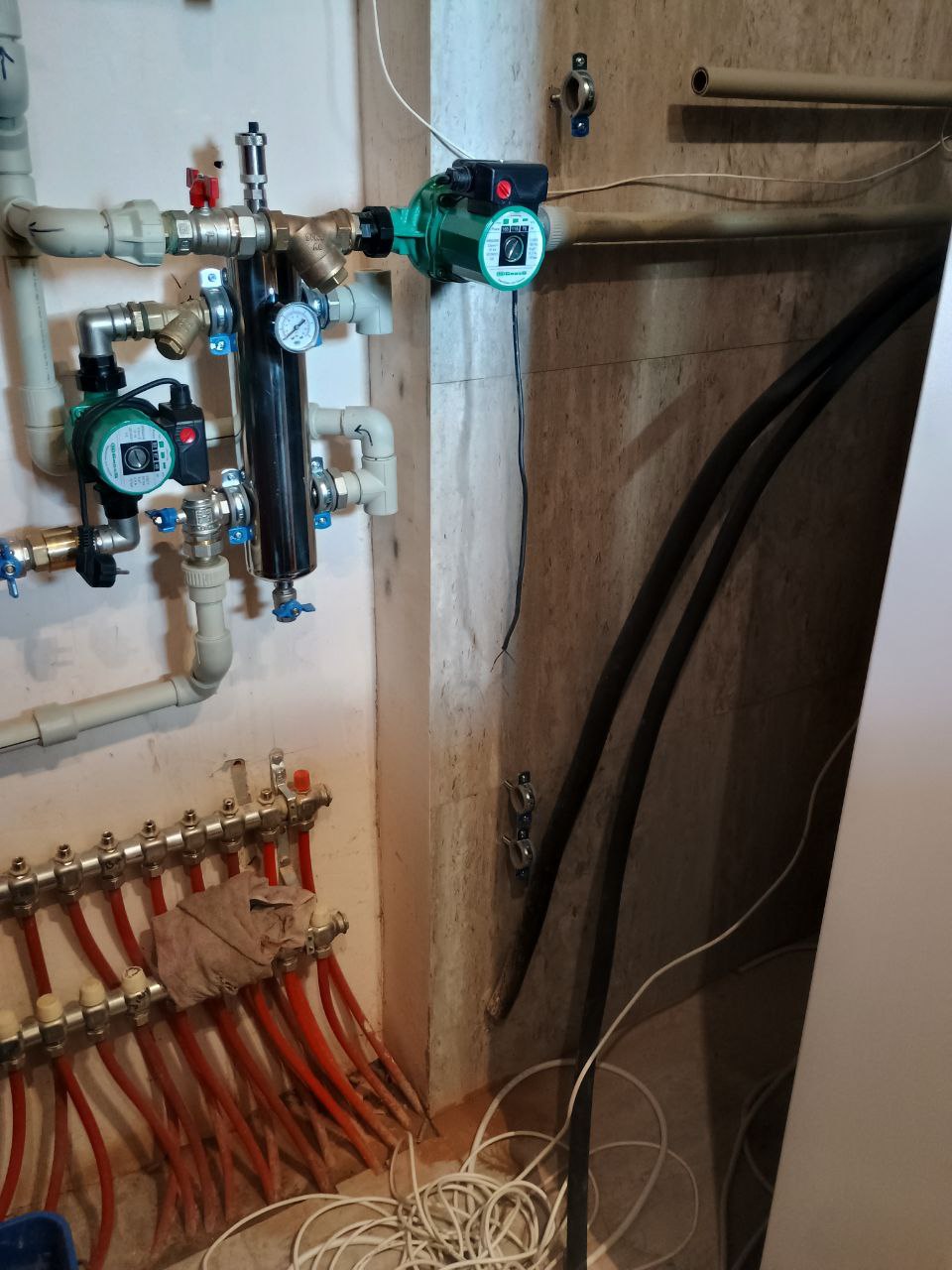 Для оптимальної роботи системи було перероблено котельну: встановлено гідравлічну стрілку, підключено насосну групу, а також було проведено розведення труб до системи теплих підлог і радіаторів. Також було прокладено магістральну трасу довжиною 15 метрів до зовнішнього блоку, що забезпечило ефективне функціонування системи опалення.