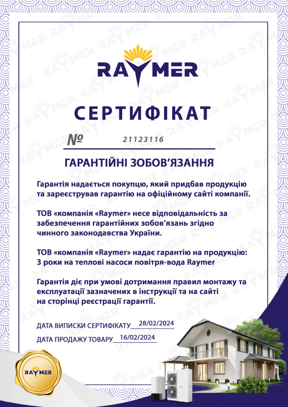 - Ефективність: Тепловий насос Raymer RAY-07MN забезпечує ефективне опалення приміщення навіть в умовах низьких температур навколишнього середовища. Висока температура на виході до 60°C гарантує комфортне тепло в будинку в будь-яку пору року.