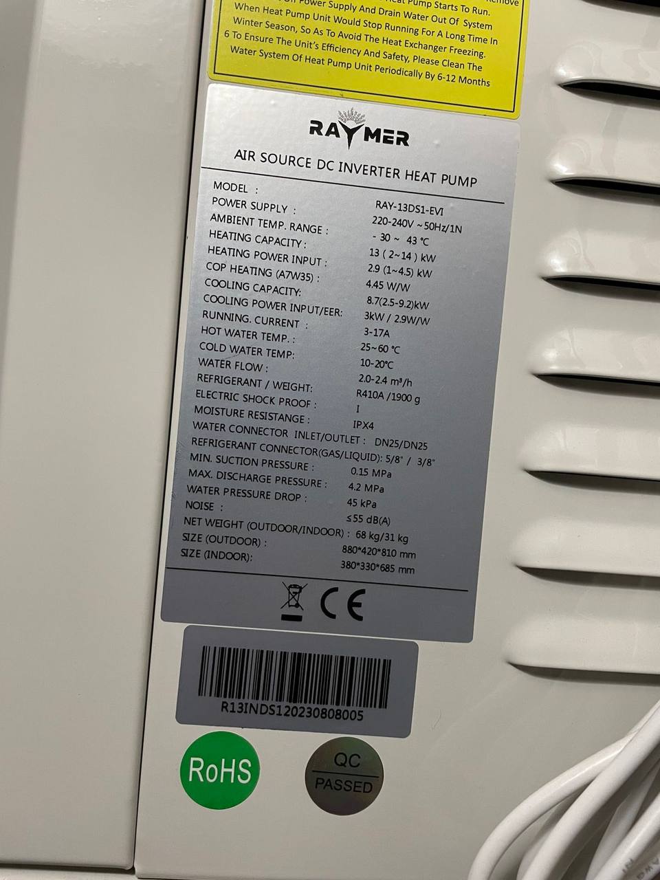 Для вирішення цього завдання було обрано спліт тепловий насос повітря-вода Raymer RAY 13DS1 EVI на 13 кВт. Цей вибір був обумовлений декількома ключовими характеристиками насоса: