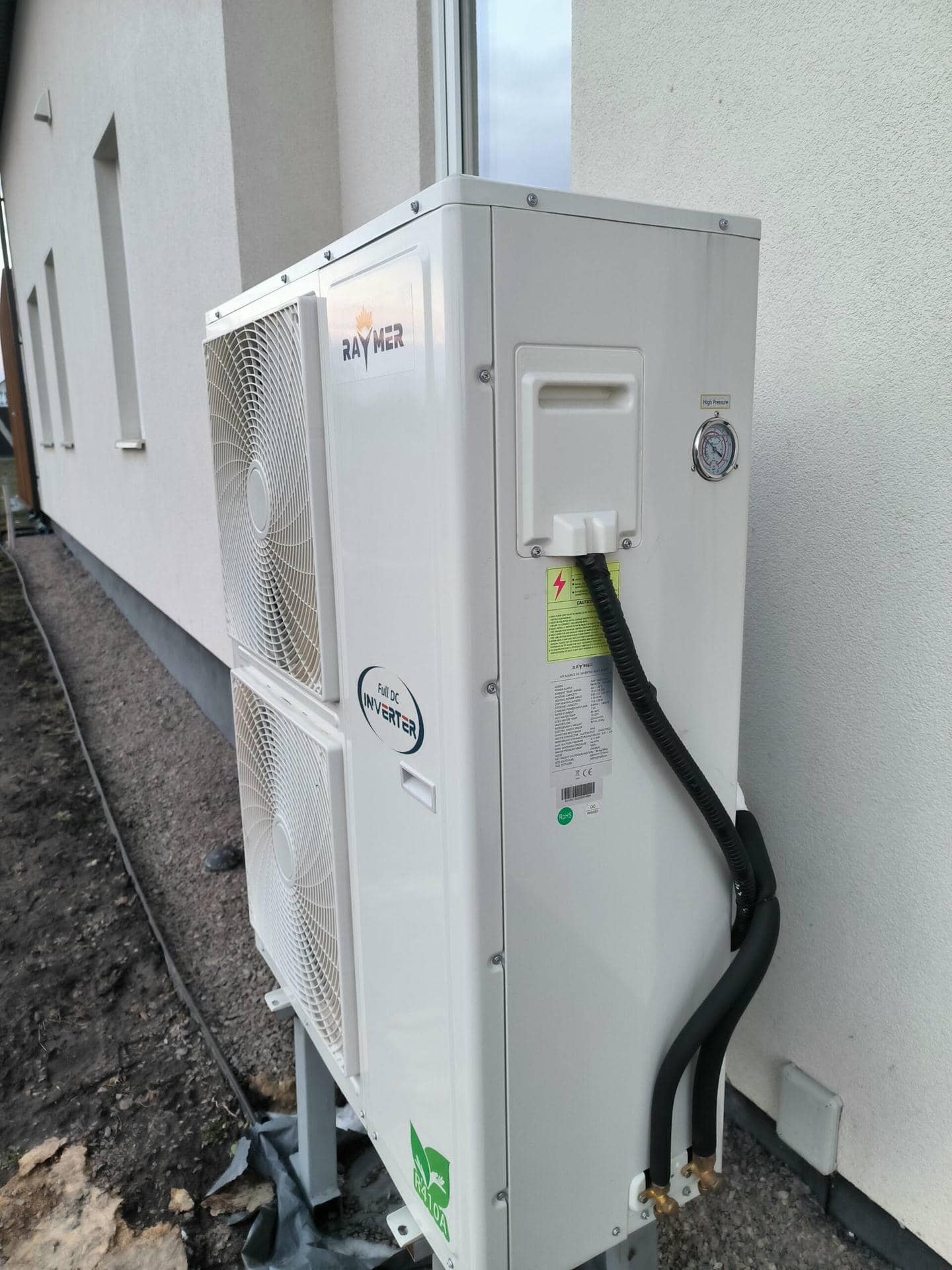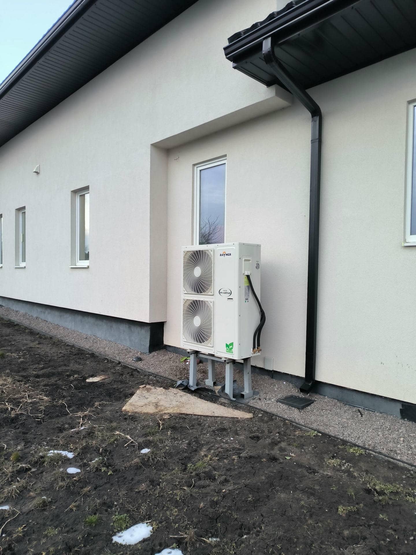 Установка теплового насоса Raymer DC inverter splitheat pump RAY-15DS1-EVI (380V) (РЕЙМЕР СПЛИТ ТЕПЛОВИЙ НАСОС) а також електрообігріву з ємністю 1000л. Площа будинку 150м². Установка теплового насосу, монтаж котельного обладнання, запуск та пусконалагодження системи виконувалось з обв’язуванням мідними трубами кваліфікованими інженерами.