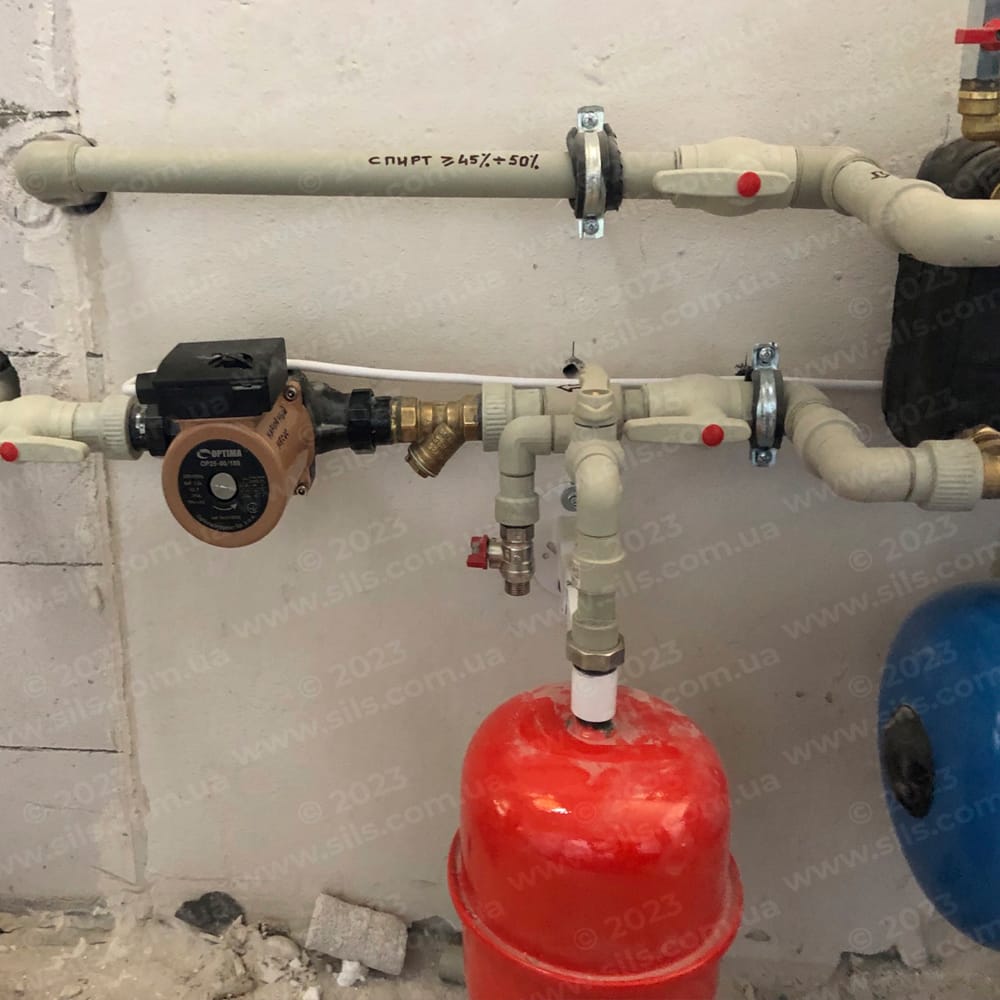 - Установка проміжного теплообмінника: Додавання теплообмінника на 30 кВт дозволило розділити потоки рідини у системі, забезпечуючи оптимальну передачу тепла від теплового насоса до системи опалення та ГВП, а також запобігання змішуванню води та спиртового розчину.