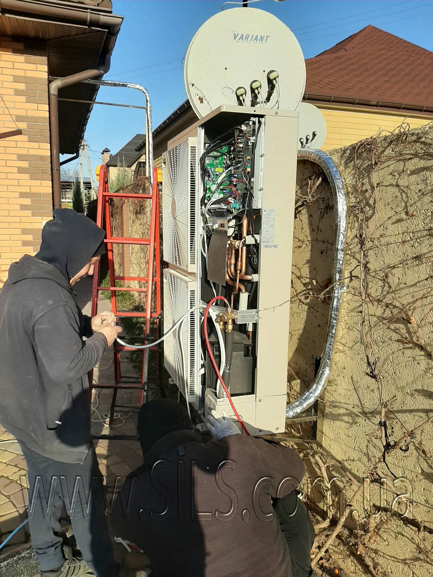 - Монтаж обладнання: Встановлення включало монтаж зовнішнього блоку теплового насоса на попередньо підготовленому і укріпленому фундаменті для забезпечення його стабільності і захисту від зовнішніх впливів. Внутрішній блок був інтегрований із системою опалення будинку, що дало змогу ефективно розподіляти тепло по приміщеннях.