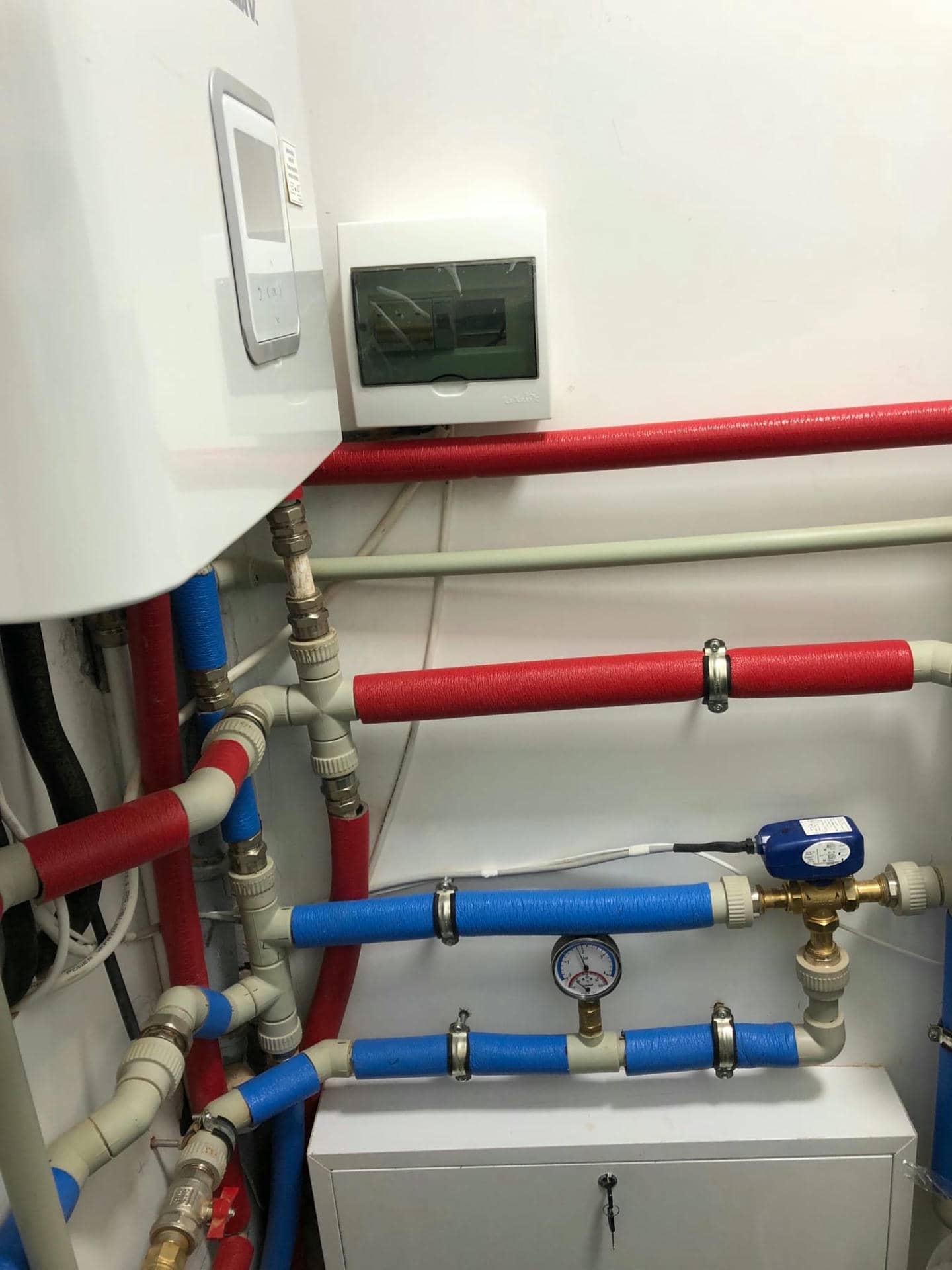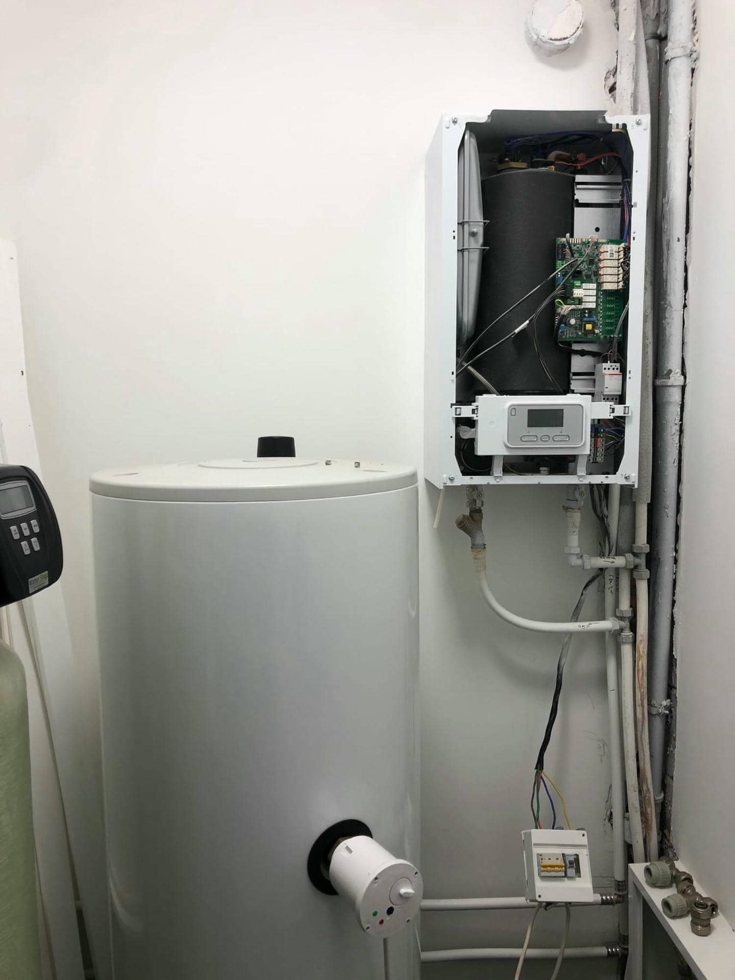 3. Підключення до системи опалення: Тепловий насос інтегровано з наявною системою опалення будинку через бак-накопичувач об’ємом 200 літрів.
