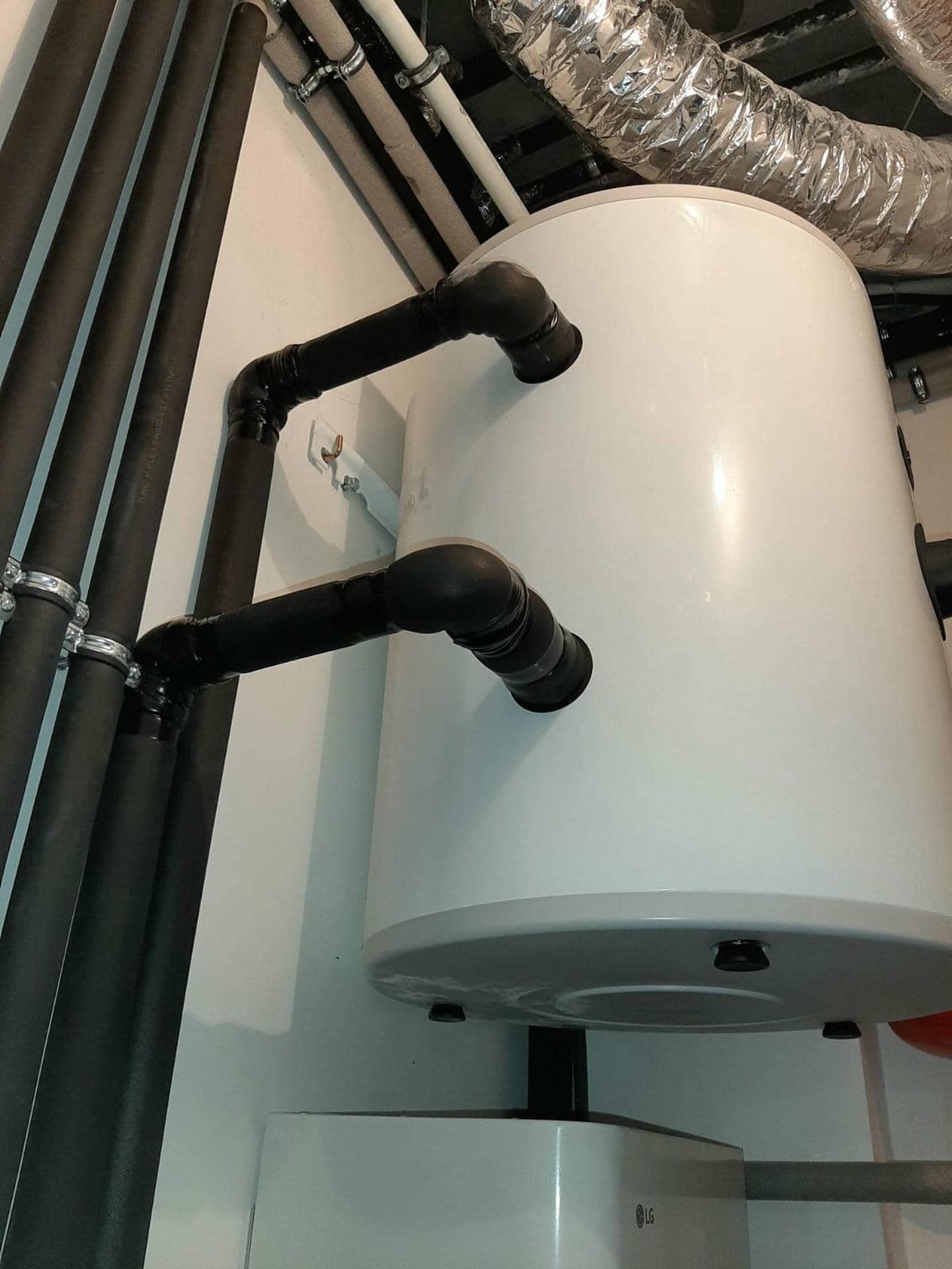 - Встановлення теплового насоса: Зовнішній блок теплового насоса було розміщено на загальному балконі з урахуванням усіх норм і стандартів безпеки. Внутрішній блок (гідромодуль) встановлений у невеликій коморі, над яким розміщено акумулювальний бак.