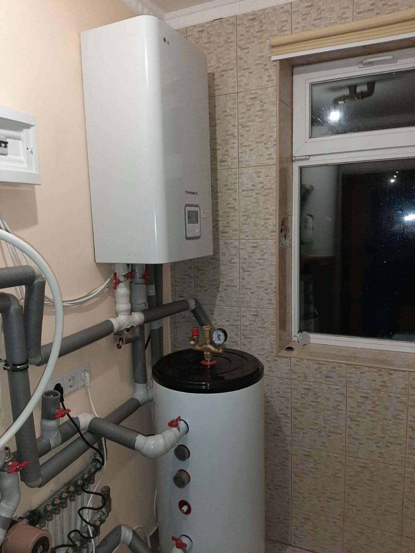 Був обраний тепловий насос LG Therma V потужністю 12 кВт з інверторною технологією для обігріву будинку та підігріву води. Додатково встановлено бак-накопичувач Raymer на 100л для оптимізації системи гарячого водопостачання.