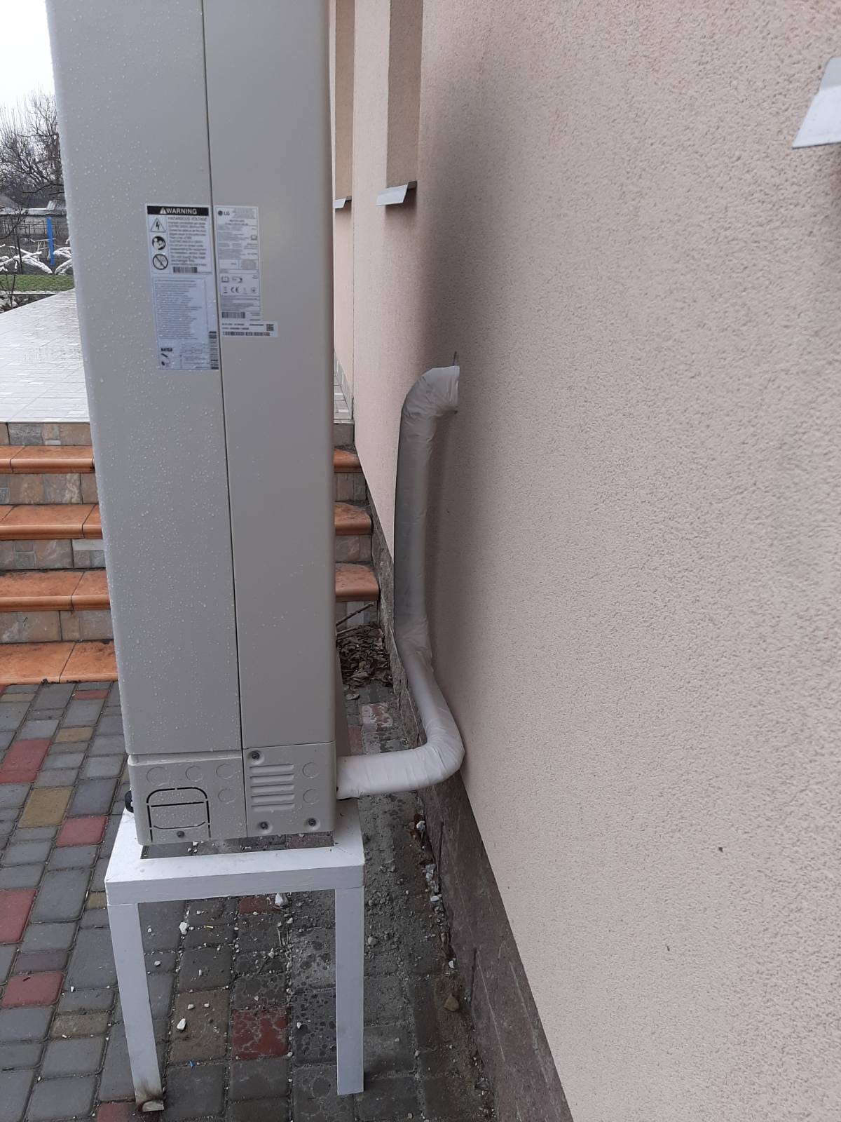 • Встановлення зовнішнього блоку: Зовнішній блок теплового насоса LG Therma V був встановлений на спеціально підготовлений постамент, що забезпечує його стабільність і захист від зовнішніх впливів. Розташування блоку було вибрано з урахуванням оптимального повітряного потоку і легкості доступу для обслуговування.