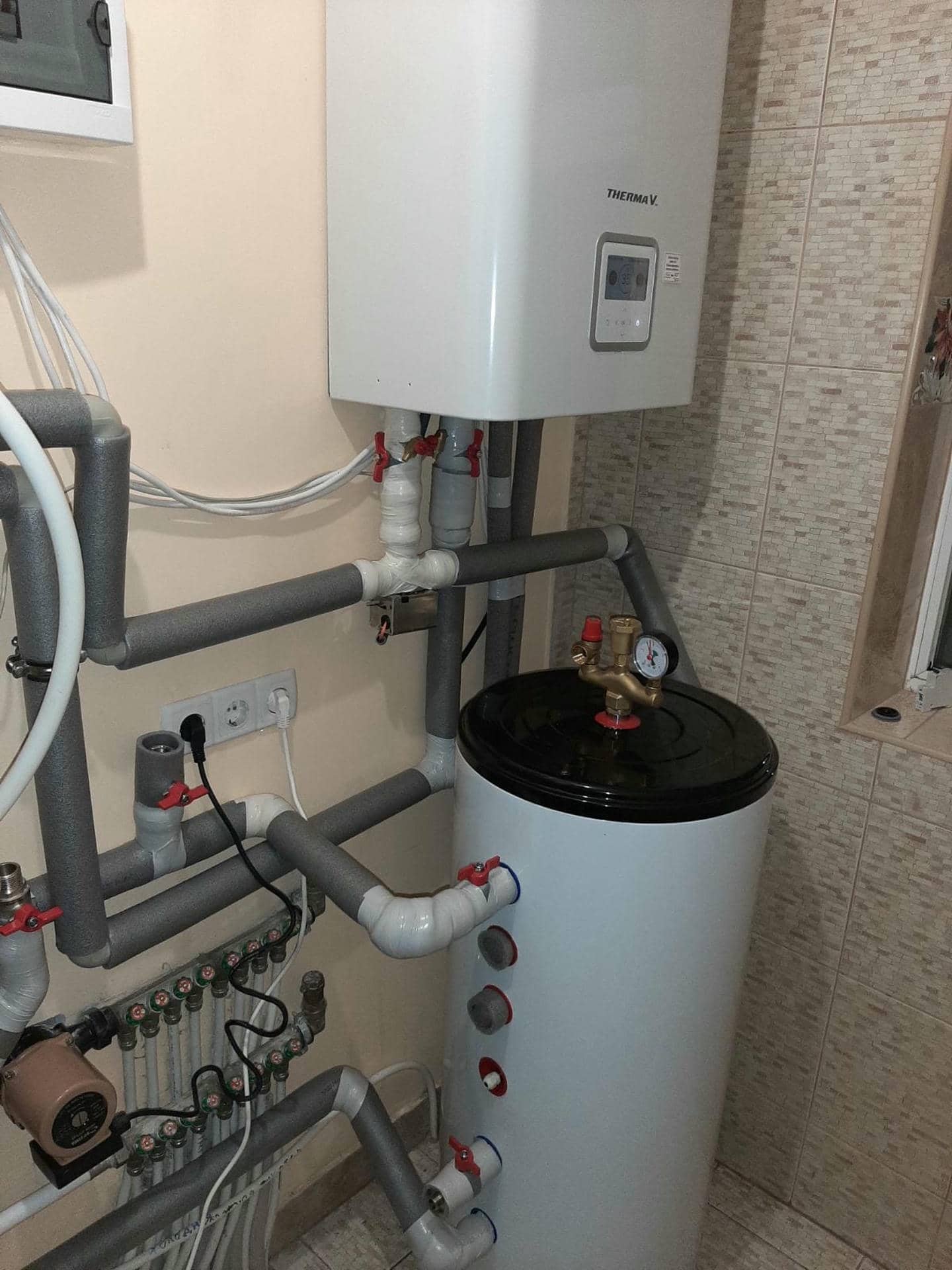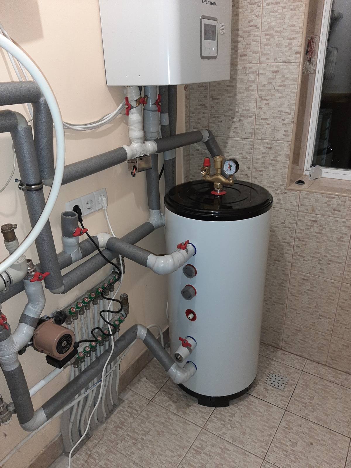 • Монтаж внутрішнього блоку і бака-накопичувача: Внутрішній блок гідромодуля встановлено в технічному приміщенні будинку з достатнім простором для обслуговування. Поруч із ним розміщено нержавіючий бак-накопичувач Raymer об’ємом 100 літрів для забезпечення постійного доступу до гарячої води.