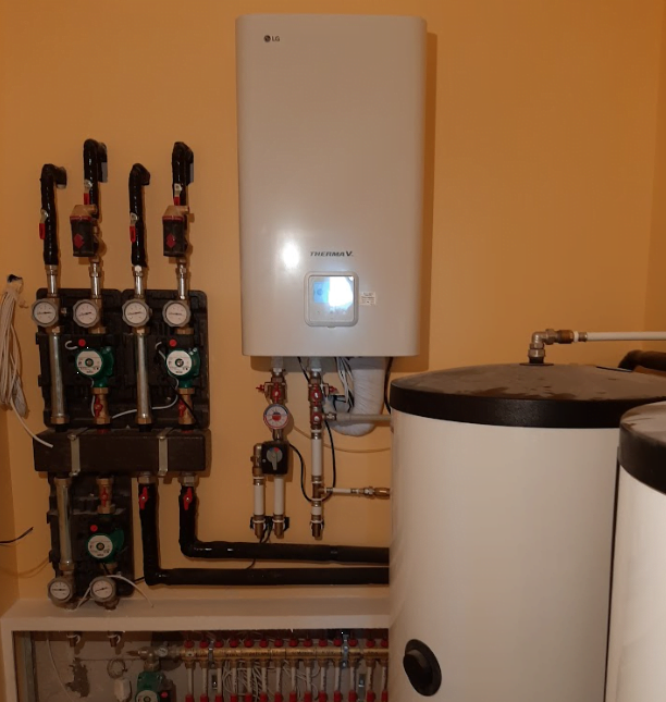 Рішення знайшлося в установці теплового насоса LG THERMA V HU123.U33 + HN1639 NK3 потужністю 12 кВт, який забезпечує незалежне опалення взимку та ефективне кондиціонування влітку. Додатково було встановлено буферну ємність UKV 300 DRAZICE для опалення та бак ГВП OKC 300 NTR/HP DRAZICE, а також настінні фанкойли Daikin для розподілу тепла й холоду по квартирі.