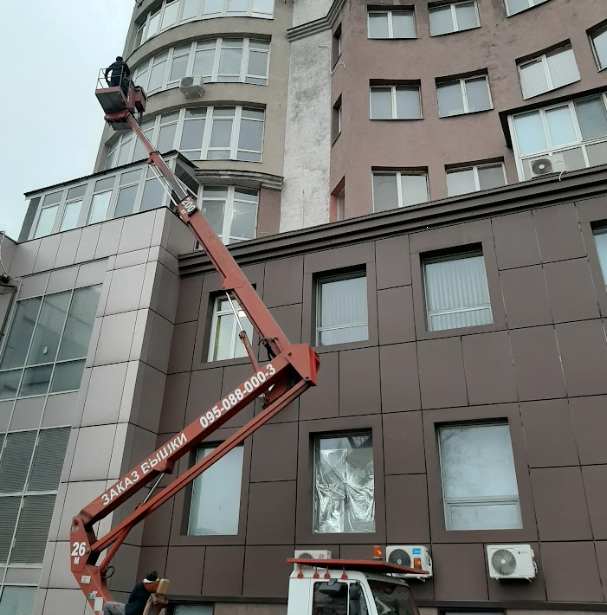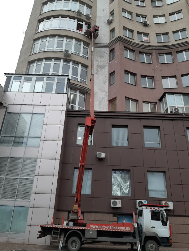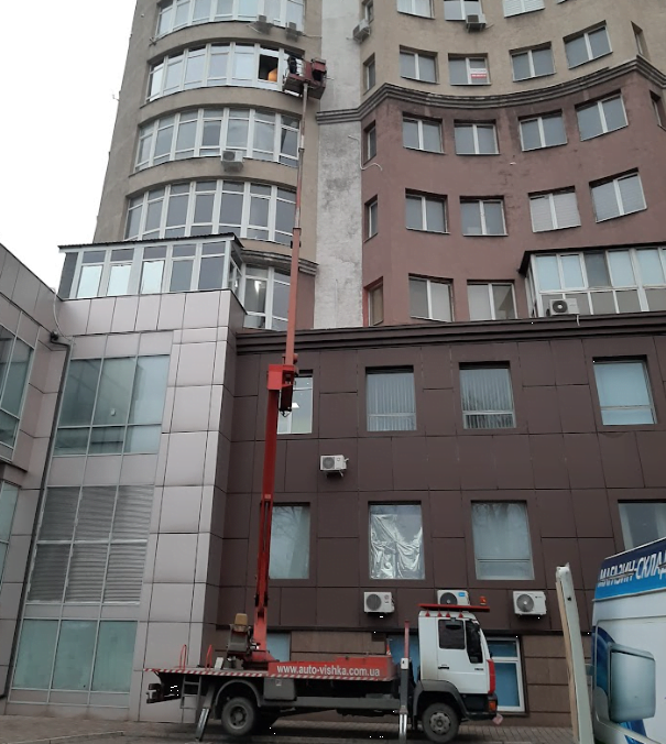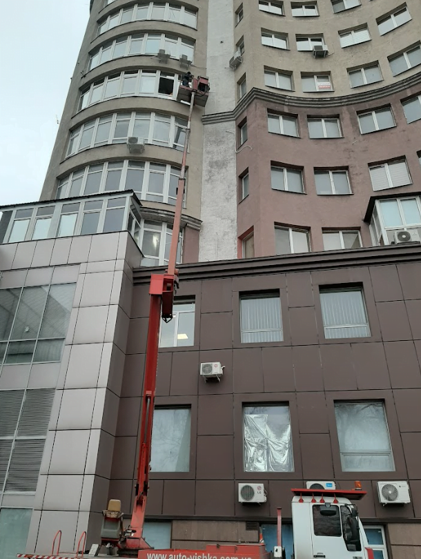 Встановлення зовнішнього блоку теплового насоса LG на 7-й поверх з використанням спеціалізованої підйомної техніки через віконний отвір.
