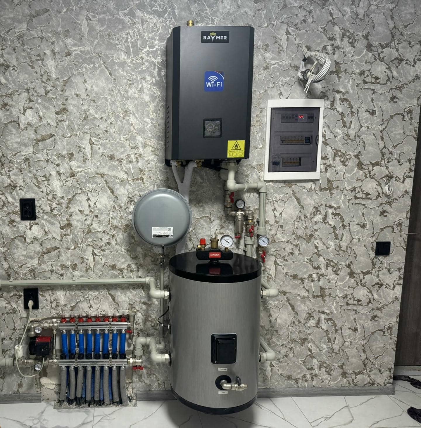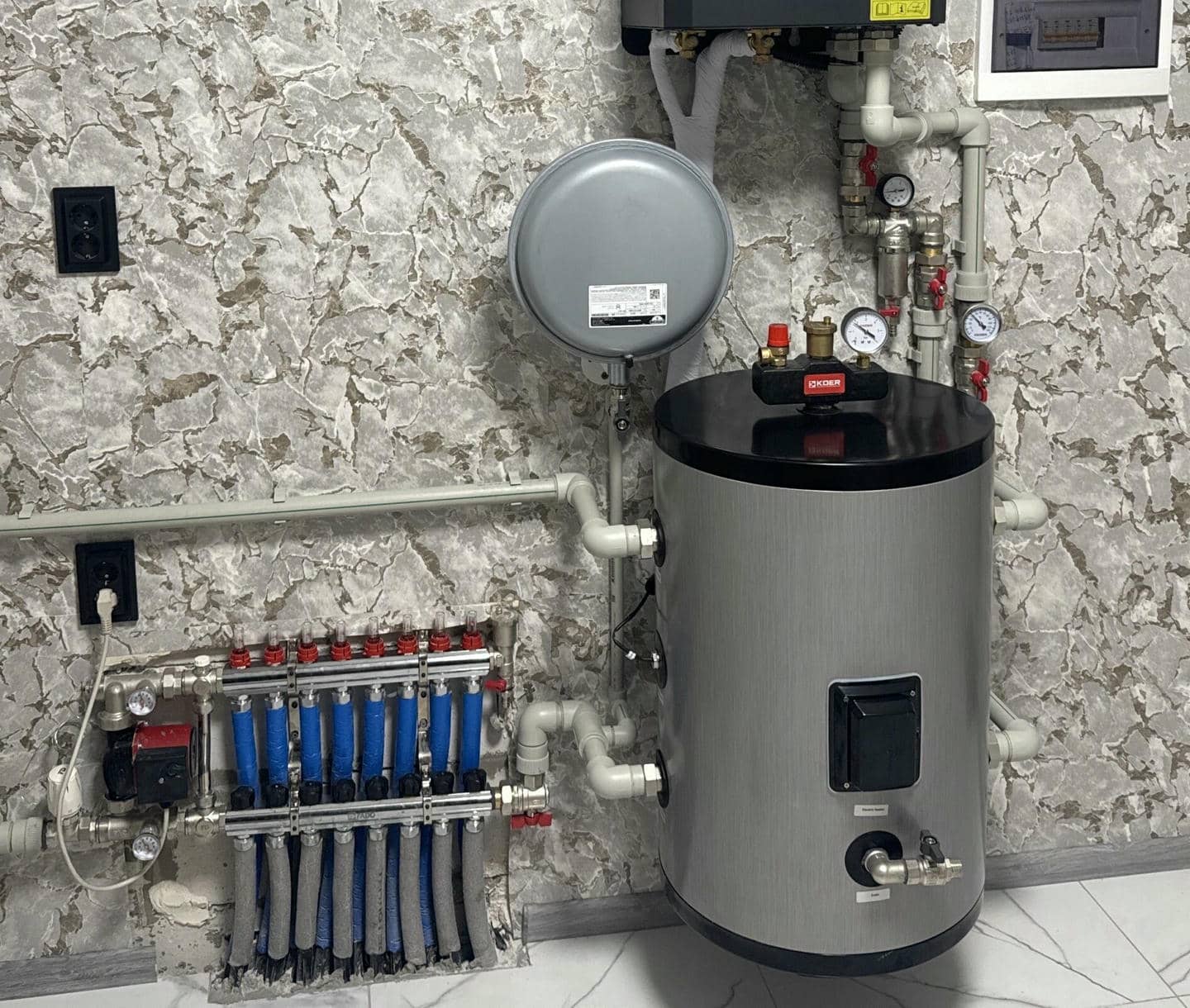 Бак-накопичувач на 60 літрів підключений до гребінки теплої підлоги, забезпечуючи ефективний розподіл тепла по всій системі. Гарячий теплоносій з гідромодуля спочатку потрапляє в бак, який виконує роль буферної ємності, стабілізуючи температуру та тиск. Далі нагріта вода надходить у подаючу гребінку, звідки рівномірно розподіляється по окремих контурах теплої підлоги.