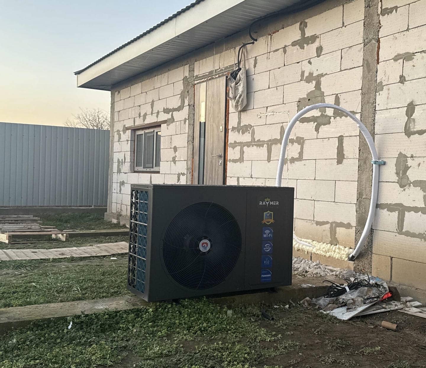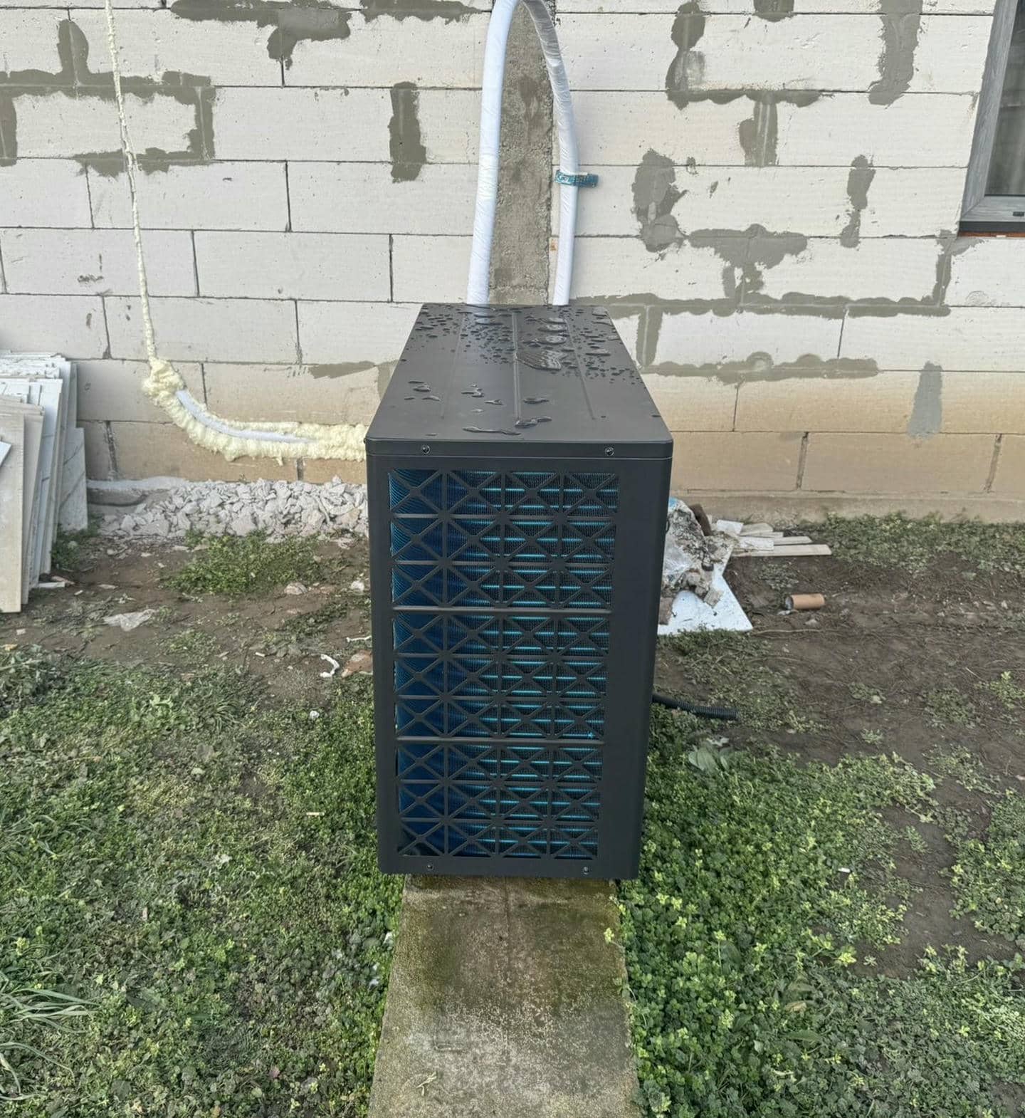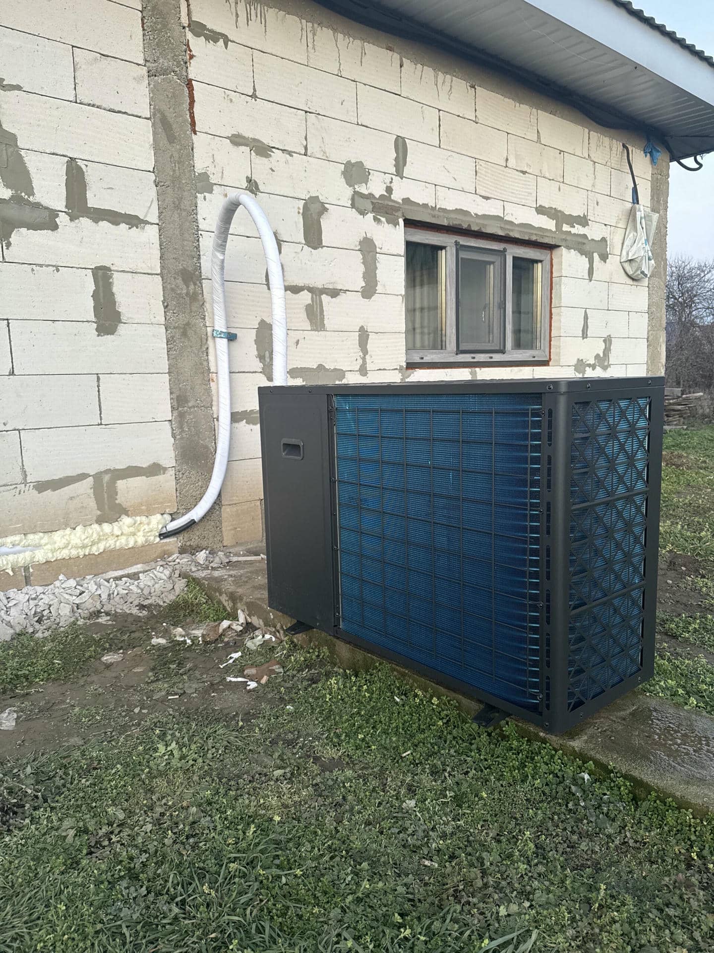 Зовнішній блок теплового насосу було тимчасово встановлено на цементному подіумі, щоб не було перешкоджання фасадним роботам. Пізніше блок буде встановлено на спеціальну підставку та розміщений біля фасадної стіни будинку.