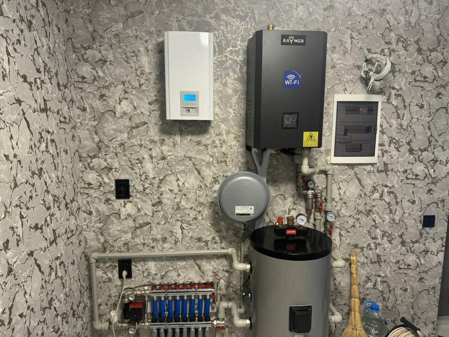 Бак-накопичувач на 60 літрів підключений до гребінки теплої підлоги, забезпечуючи ефективний розподіл тепла по всій системі. Гарячий теплоносій з гідромодуля спочатку потрапляє в бак, який виконує роль буферної ємності, стабілізуючи температуру та тиск. Далі нагріта вода надходить у подаючу гребінку, звідки рівномірно розподіляється по окремих контурах теплої підлоги.