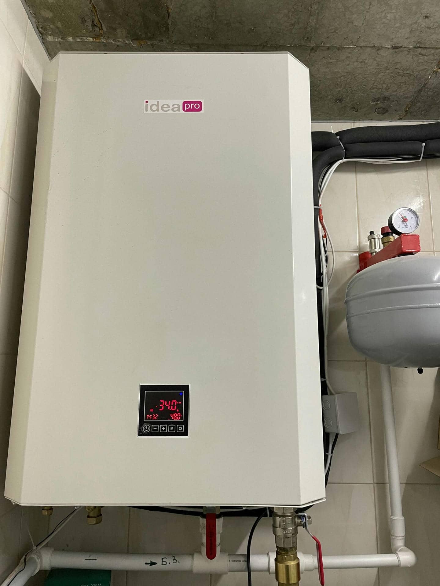 Роботи з монтажу зовнішнього блоку охоплювали підготовку фундаменту і прокладання комунікаційних магістралей для з’єднання зовнішнього і внутрішнього блоків. Внутрішній блок встановлений у напівпідвальному приміщенні, де також розміщені акумулювальний бак і бак для гарячого водопостачання.