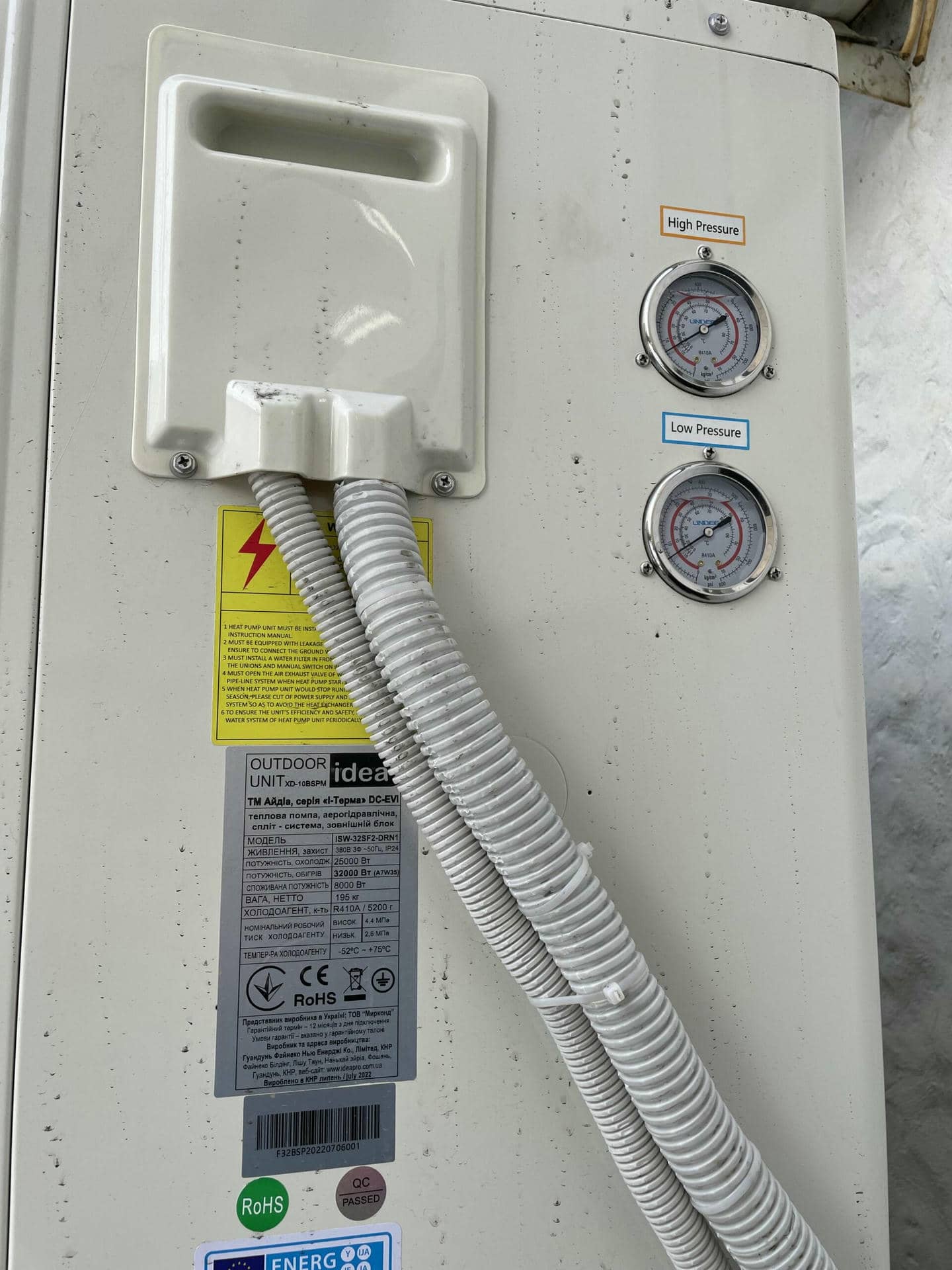 Рішення: Був обраний тепловий насос повітря-вода IDEA ISW-18SF2-DRN1/ISW-18SF2-SPM потужністю 18 кВт (380V), здатний працювати в широкому діапазоні температур від -25 до +43°C. З огляду на утеплення будинку і наявність середньотемпературного передавача тепла (тепла підлога і розширені радіатори сталевого типу), система оптимізована для забезпечення комфортної температури в холодні місяці.
