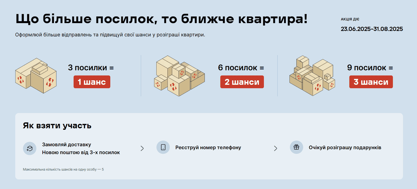 Кожні 3 успішно отримані доставки = 1 шанс на виграш квартири. Максимум — 5 шансів.